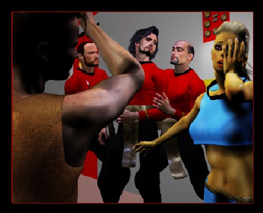 He threw her to the bed, immediately pouncing on her. He forced her to her hands and knees, facing the Tantalus screen, his hand once more holding onto her hair like some obscene pair of reins. She felt him opening his pants, pushing her skirt up over her hips, and cried out when he penetrated her with lustful fury, the sound turning to one of despairing horror when, on the screen, Spock did the exact same thing to Jilla.