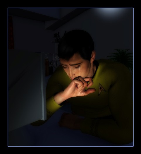 Yeah, he reflected. I know that feeling real well. After all, I've never mourned you, have I, Kam? Maybe it would help you to know that I do know how you feel - except I can't ever tell you. I can't mourn you, Sulu, because doing so would hurt you. And if there's one thing I'll never do, it's hurt you with the fact that I love you and you don't love me. Fuck. Where’s a closet psychiatrist when l need one?