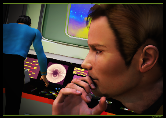 Kirk stood and paced thoughtfully for a few seconds before returning to stand in front of her chair. “Under normal circumstances, Miss Valley, if someone accused my First Officer of something like this, I’d send them to see Dr. McCoy, or to the Brig. Not this time. I believe you.” He looked directly into her eyes, knowing the surprise he’d see there, even though she had been the one to make the complaint. He kept his expression concerned, his tone serious but reasonable. “I’m sure Mr. Spock said what you say he did. I’m also sure he didn’t mean it. He’s not a violent man, as you well know – at least not normally. But I also know you’ve noticed how tense he’s been. I assure you, so have I.” He sighed deeply. “Miss Valley, he’s under direct observation. Dr. McCoy doesn’t know what’s wrong with him yet. So I’m asking you to wait on this complaint.” He made an effort to project all the earnest compassion Jim Kirk was capable of. “Just for a few days, until McCoy can sort it out. I’m not denying the seriousness of it, or that you shouldn’t be treated this way, and if it happens again – “ He shook his head in a sudden dismissing manner. “No, I’m sure it won’t.” Again, he met her gaze. “Please, Lieutenant, for now, bear with it. For the good of the ship, for Spock… please.”