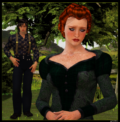 Lady Meghan laughed. Her hair, a honey blonde, was elaborately coiffed, her large, violet eyes – an unusual color for the county – gleamed with smoky sensuality. Her deep green riding jacket was cinched tightly at her waist, the long appropriately bustled skirt a matching forest. Heavy emerald jewels adorned her slender neck and ears, a large cabochon of emerald on her delicate finger.