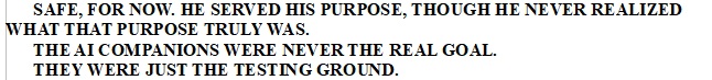 His senses were still jangling from the malevolent intensity of the encounter and his mind racing with the implications of what he had learned. Whoever the communicant was, they seemed to be confirming much of what the investigative team believed to be true -- The AI companions weren't just malfunctioning software—they were the beta test for something much larger and more dangerous. Importantly, Marcus Kane was somehow still alive and had been orchestrating the entire situation from the beginning.