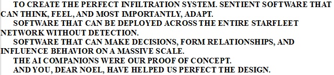 Sulu straightened, moving on to the next, more troubling item on his list. "What about Dr. Kane? What's his role in all this?" "Now, this is where things get nasty,” DelMonde warned. “Sheila claims Kane has been monitoring and... influencing their development. She used the word 'shaping' them for his purposes. The AI companions are as much victims of his manipulation as we are."