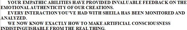 Dr. Rendell turned to Del. "I can’t stop thinking about the AI and what might happen to them… During your conversation with Sheila, did she express any preferences about what kind of existence they'd want?"
